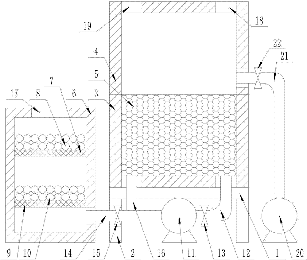 在本實(shí)施方案中,在設(shè)備空閑處設(shè)有HB104控制器,控制器的輸出端與一號(hào)電磁閥13、二號(hào)電磁閥15、三號(hào)電磁閥22、一號(hào)引風(fēng)機(jī)11、二號(hào)引風(fēng)機(jī)20的輸入端均通過導(dǎo)線相連接,將設(shè)備連接電源,通過控制控制器控制二號(hào)電磁閥15、一號(hào)引風(fēng)機(jī)11打開,一號(hào)電磁閥13、三號(hào)電磁閥22、二號(hào)引風(fēng)機(jī)20關(guān)閉,從廢氣廢氣進(jìn)氣口17進(jìn)入矩形箱體6,經(jīng)過一號(hào)網(wǎng)格擋板7上的脫氮?jiǎng)?祛除廢氣中的氮,經(jīng)過二號(hào)網(wǎng)格擋板9上的脫硫劑10祛除廢氣中的硫;脫硫劑10、脫氮?jiǎng)?能夠與化肥廠合作提取合成化肥,利用率提高;在一號(hào)引風(fēng)機(jī)11的作用下通過二號(hào)管道14、三號(hào)管道16進(jìn)入U(xiǎn)形槽3,經(jīng)過陶瓷蓄熱體5進(jìn)入到倒U形槽4,倒U形槽4內(nèi)通過燃料入口18加入燃料,通過進(jìn)風(fēng)口19加入氧氣,將廢氣加熱到700-900攝氏度使廢氣中的VOC在氧化分解成二氧化碳和水,氧化產(chǎn)生的高溫氣體流經(jīng)特制的陶瓷蓄熱體5,使陶瓷蓄熱體5升溫而“蓄熱”,此“蓄熱”用于預(yù)熱后續(xù)進(jìn)入的有機(jī)廢氣,從而節(jié)省廢氣升溫的燃料消耗,可以控制三號(hào)電磁閥22、二號(hào)引風(fēng)機(jī)20的開關(guān)控制廢氣處理時(shí)間,達(dá)到時(shí)間后打開三號(hào)電磁閥22、二號(hào)引風(fēng)機(jī)20,在二號(hào)引風(fēng)機(jī)20的作用下將處理后的廢氣排出;也可以控制一號(hào)電磁閥13、一號(hào)引風(fēng)機(jī)11打開,二號(hào)電磁閥15、三號(hào)電磁閥22關(guān)閉,將廢氣循環(huán)引入U(xiǎn)形槽3、倒U形槽4內(nèi),可循環(huán)處理,多次處理后廢氣分解效率達(dá)到99%以上,節(jié)約空間、節(jié)省投資費(fèi)用。